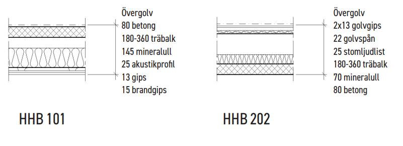 Hybridbjälklaget har goda ljud- och vibrationsegenskaper. Efter komplettering nås ljudklass B redan vid bygghöjd 313 millimeter.